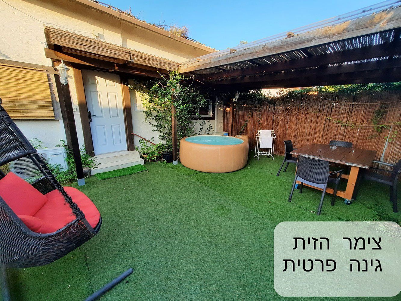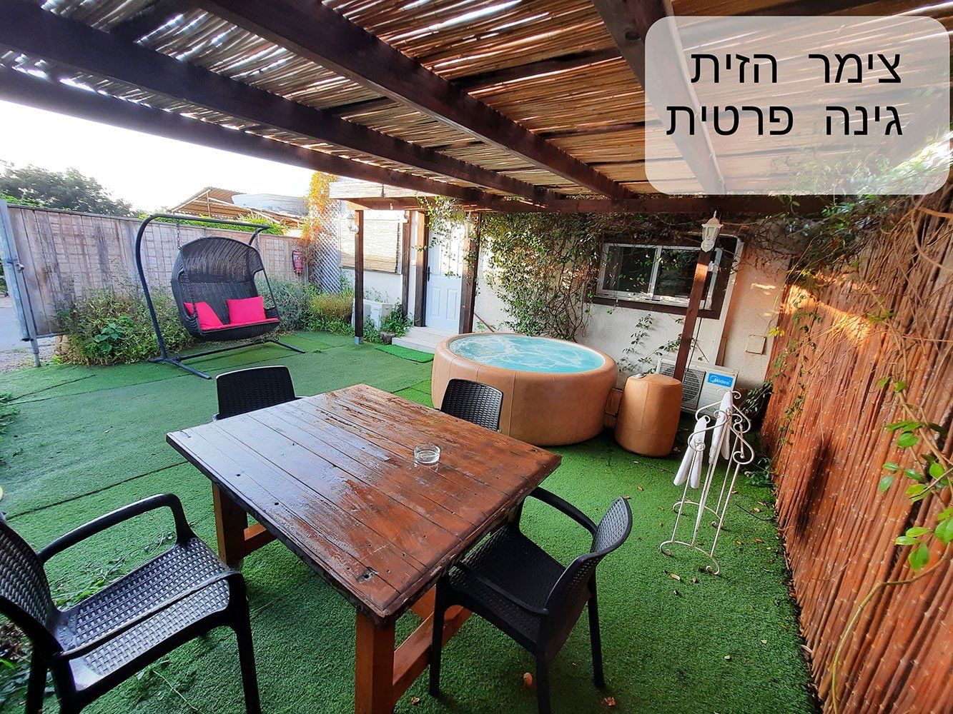 בגינת הצימר פינת ישיבה מוצלת, נדנדה וגקוזי גדול פרטי, מחוץ לגינה פינת מנגל פרטית עם תאורה לילית.